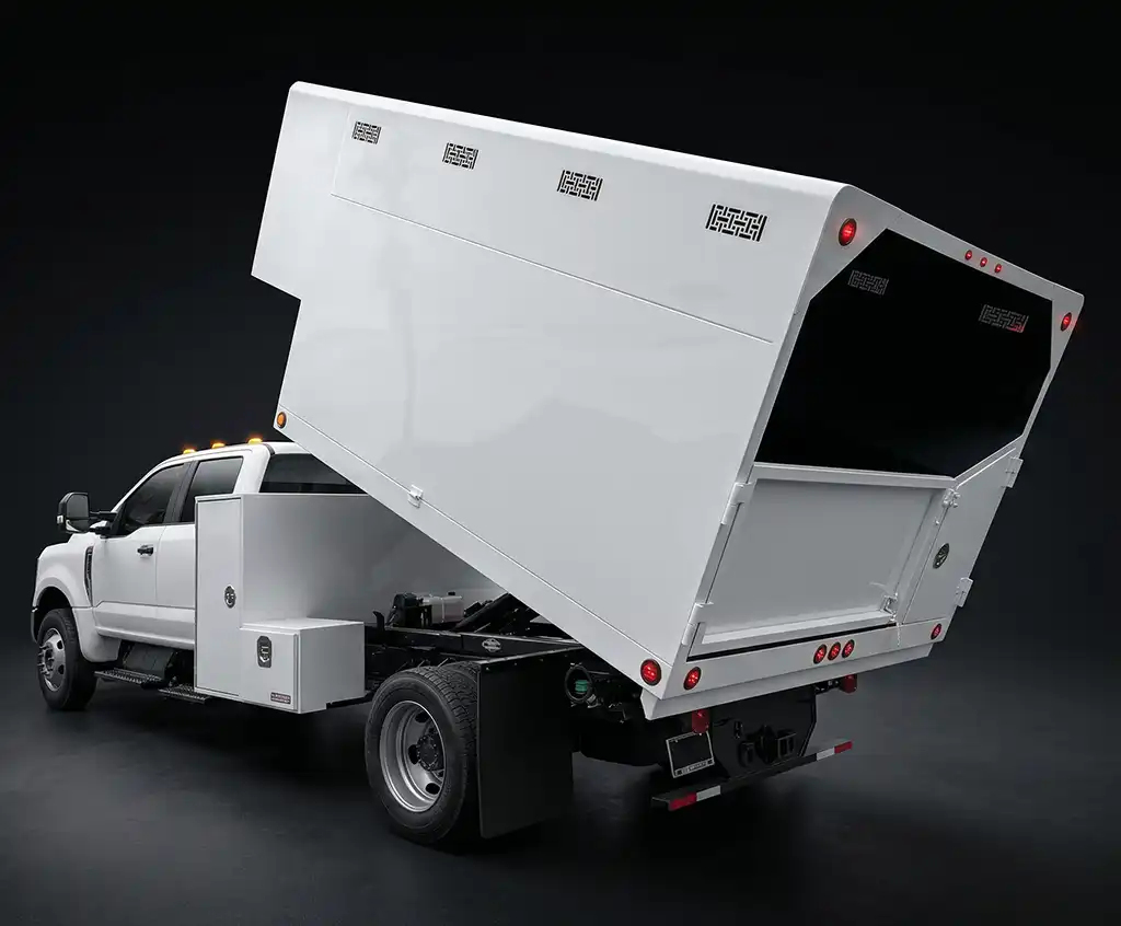 Reinforced steel dump body engineered for repeated loading and dumping cycles.